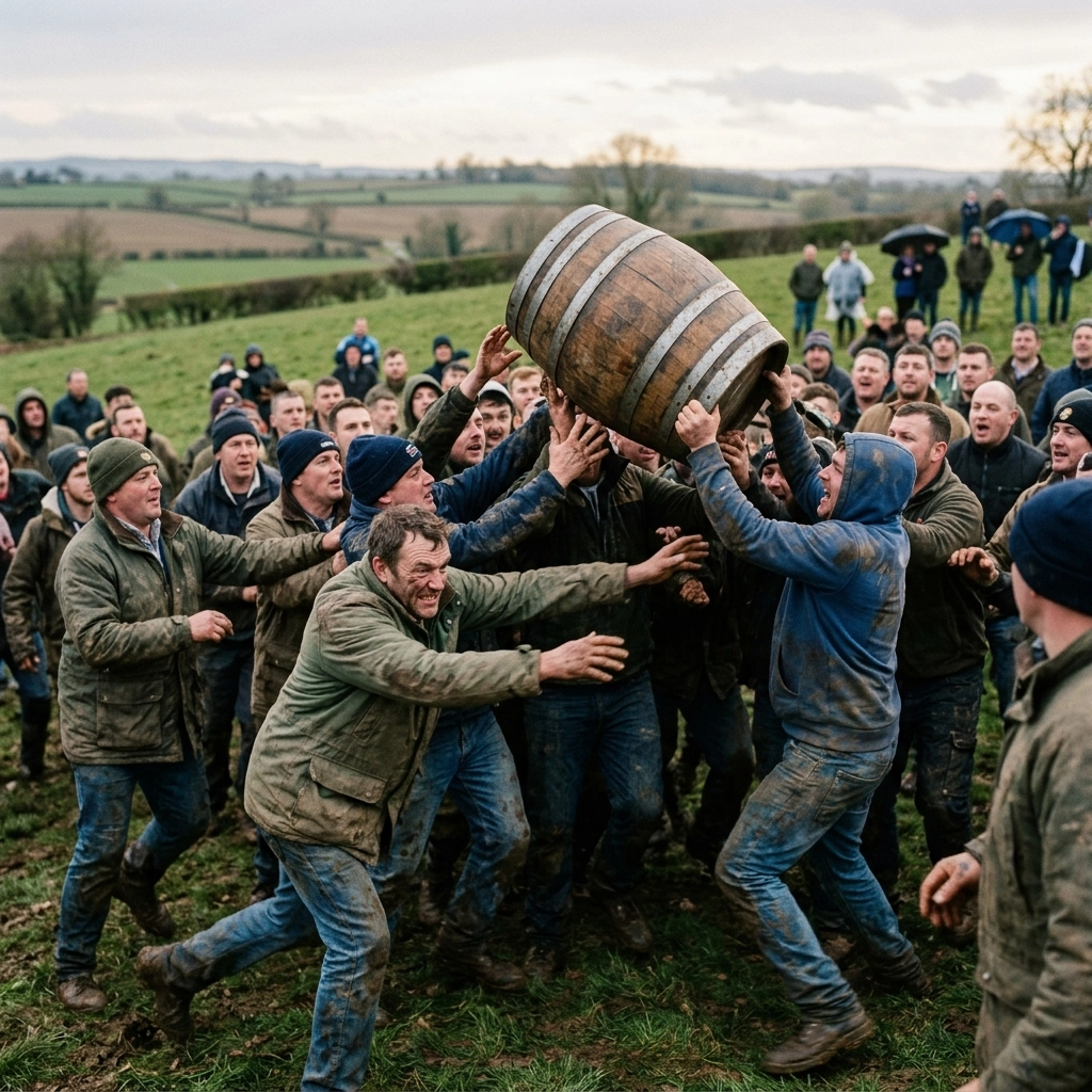 What makes this particularly striking is the complete lack of a formal pitch. The "field of play" is whatever lies between the starting point and the streams. This includes ploughed fields, thorny hedgerows, and steep embankments. There is a magnificent, rugged honesty to the way the bottles are moved. There is no kicking involved, despite the name; it is a game of pushing, pulling, carrying, and occasionally hoarding the barrel beneath a pile of twenty grown men. It is a test of collective will, where the heavy wooden kegs become the most valuable objects in the county for a few hours of sweat-soaked lunacy.